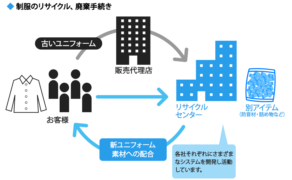 廃棄ユニフォームの扱いが問題となり、協議会メンバーの中には、産業廃棄物広域処理業者の資格を取得しリサイクルを推進するところもあります。また、合繊や紡績メーカーが主導して立ち上げた産業廃棄物広域認定資格を持ったリサイクルネットワークもあり、それぞれにメーカーが加盟しています。技術が進み、廃棄ポリエステル繊維製品から直接ポリエステル繊維を作る技術も開発されています。